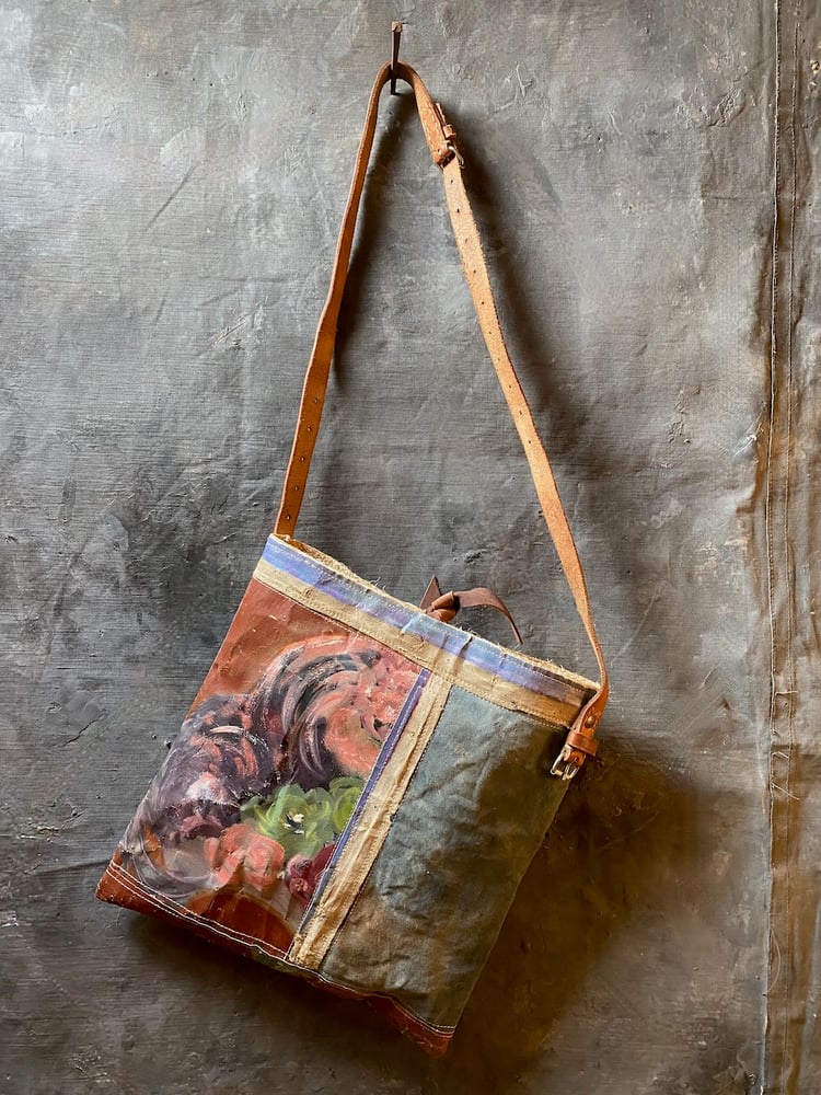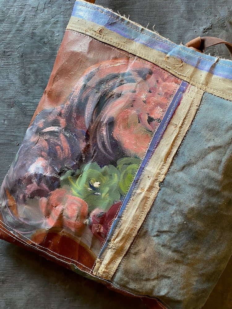A SERIES OF UNIQUE, LEATHER HANDLED CARRY BAGS MADE BY HAND USING VINTAGE OIL PAINTINGS SOURCED EXCLUSIVELY FROM MARKETS IN HOLLAND AND BELGIUM. EACH BAG TELLS ITS OWN STORY THROUGH THE JUXTAPOSITION OF TIMEWORN PAINTED CANVASES, MAKING EACH ONE A DISTINCTIVE PIECE OF FUNCTIONAL, WEARABLE ART. THIS SERIES OF CARRY BAGS ARE STRONG, VERSATILE AND SPACIOUS, AND ARE DESIGNED TO SHOW SIGNS OF WEAR WITH USE & AGE SO THAT THEIR STORIES LIVE ON.
