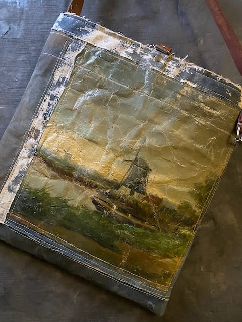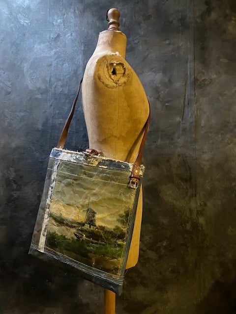 A SERIES OF UNIQUE, LEATHER HANDLED CARRY BAGS MADE BY HAND USING VINTAGE OIL PAINTINGS SOURCED EXCLUSIVELY FROM MARKETS IN HOLLAND AND BELGIUM. EACH BAG TELLS ITS OWN STORY THROUGH THE JUXTAPOSITION OF TIMEWORN PAINTED CANVASES, MAKING EACH ONE A DISTINCTIVE PIECE OF FUNCTIONAL, WEARABLE ART. THIS SERIES OF CARRY BAGS ARE STRONG, VERSATILE AND SPACIOUS, AND ARE DESIGNED TO SHOW SIGNS OF WEAR WITH USE & AGE SO THAT THEIR STORIES LIVE ON.