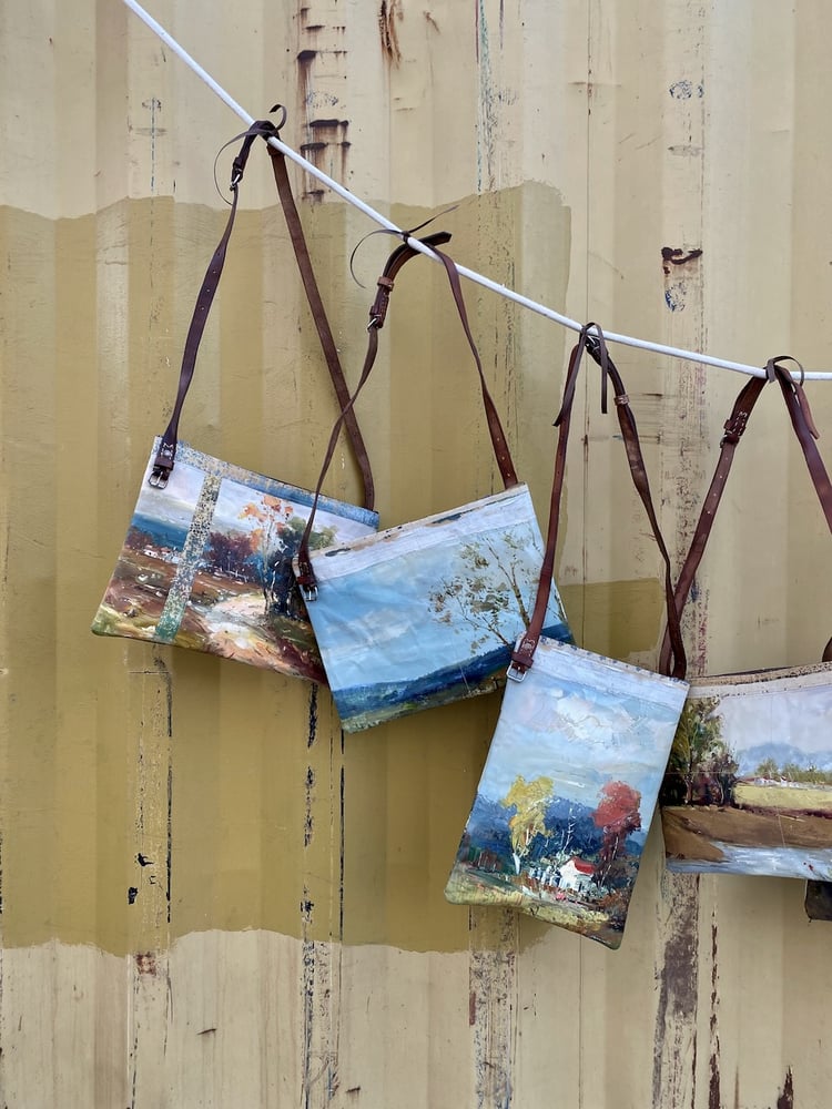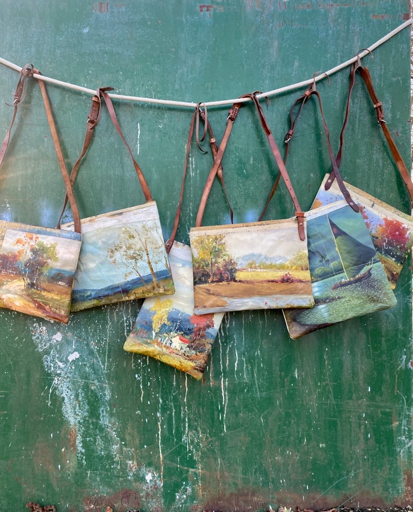 A SERIES OF UNIQUE, LEATHER HANDLED CARRY BAGS MADE BY HAND USING VINTAGE OIL PAINTINGS SOURCED EXCLUSIVELY FROM MARKETS IN HOLLAND AND BELGIUM. EACH BAG TELLS ITS OWN STORY THROUGH THE JUXTAPOSITION OF TIMEWORN PAINTED CANVASES, MAKING EACH ONE A DISTINCTIVE PIECE OF FUNCTIONAL, WEARABLE ART. THIS SERIES OF CARRY BAGS ARE STRONG, VERSATILE AND SPACIOUS, AND ARE DESIGNED TO SHOW SIGNS OF WEAR WITH USE & AGE SO THAT THEIR STORIES LIVE ON.