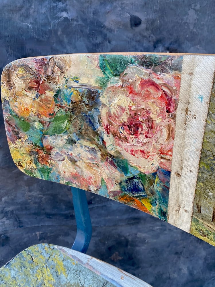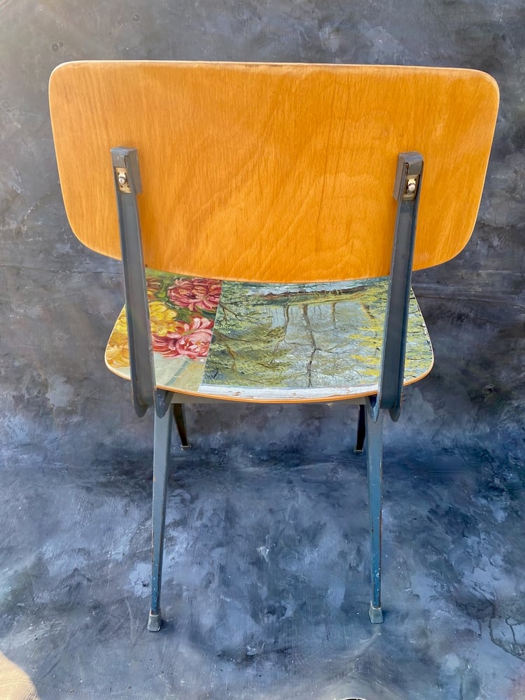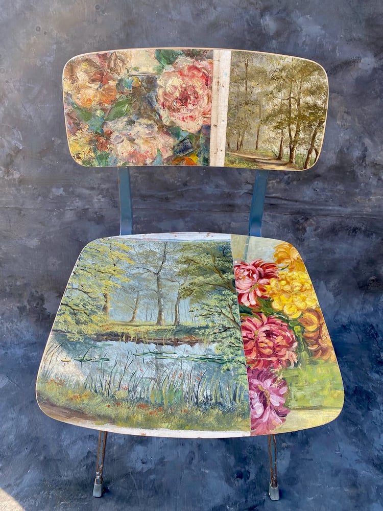 IMAGINE A FAVORITE CANVAS SLIDING OFF THE WALL AND SEEPING OVER YOUR DINING CHAIRS. SWARM’S BESPOKE CHAIRS UTILIzE MID CENTURY AND SCHOOLHOUSE CHAIRS TO REINVENT THE SURFACE AND CREATE A DECORATIVE ELEMENT TO INTERIORS. VINTAGE PAINTINGS ARE GATHERED FROM MARKETS IN BELGIUM, NETHERLANDS AND FRANCE - THEN COLLAGED, SANDED AND SEALED.