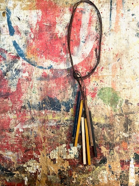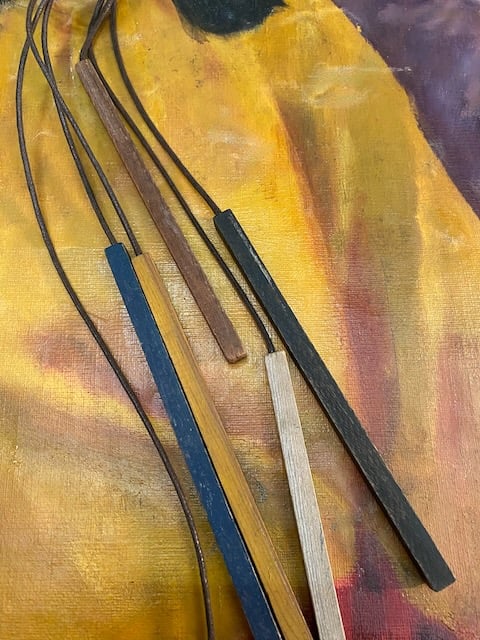 simple elongated wood game pieces attached to leather cord and simply tied around the neck.
